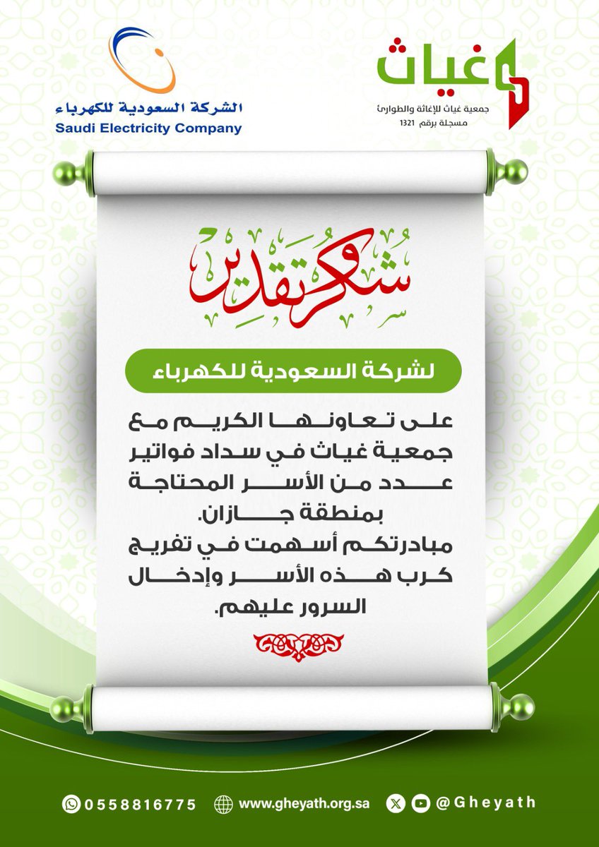 شكرًا لـ الشركة السعودية للكهرباء على تعاونها الكريم مع جمعية #غياث في سداد فواتير عدد من الأسر المحتاجة بمنطقة #جازان. مبادرتكم أسهمت في تفريج كرب هذه الأسر وإدخال السرور عليهم